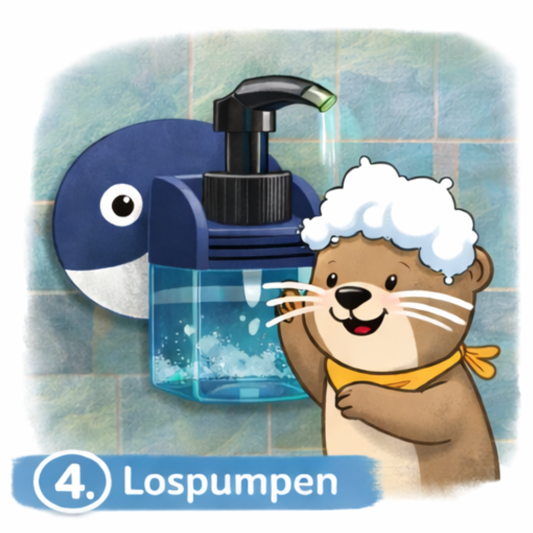 Für sicheren Halt sorgen 4 super starke Klebepads. Ankleben, auffüllen, lospumpen – fertig! Milder und tränenfreier Duschschaum sorgt für die Extraportion Spaß.